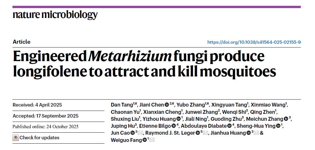 2025年10月24日,我所疟疾研究团队与浙江大学方卫国教授等合作在Nature子刊(Nature Microbiology,IF=19.4,中科院1区top期刊)在线发表了题为“Engineered Metarhizium fungi produce longifolene to attract and kill mosquitoes”的研究性论著,首次揭示了基因改造绿僵菌高效释放长叶烯吸引并杀死蚊虫的作用机制,为蚊媒传染病传播媒介控制提供了全新的研究思路和视角。