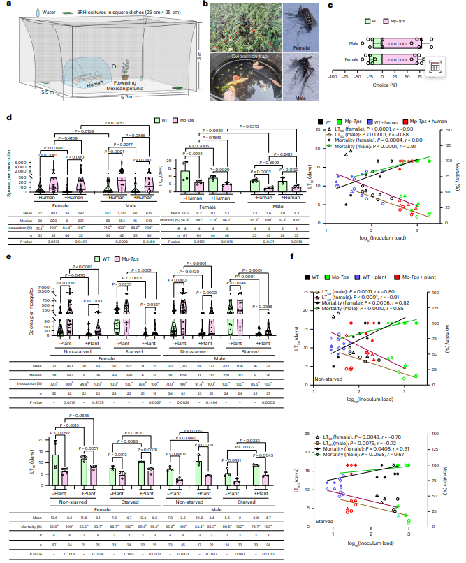 随后,研究团队尝试用长叶烯“武装”绿僵菌,为它们的传播“铺路”。研究团队进行了一项改造:将植物中合成长叶烯的基因转入绿僵菌。让这种新型的菌株能散发出浑然天成的、蚊子喜欢的“木质香”,循香而来的蚊子不经意间就会沾上绿僵菌的孢子,这些孢子会在蚊子体内大量繁殖,最终置蚊子于死地。