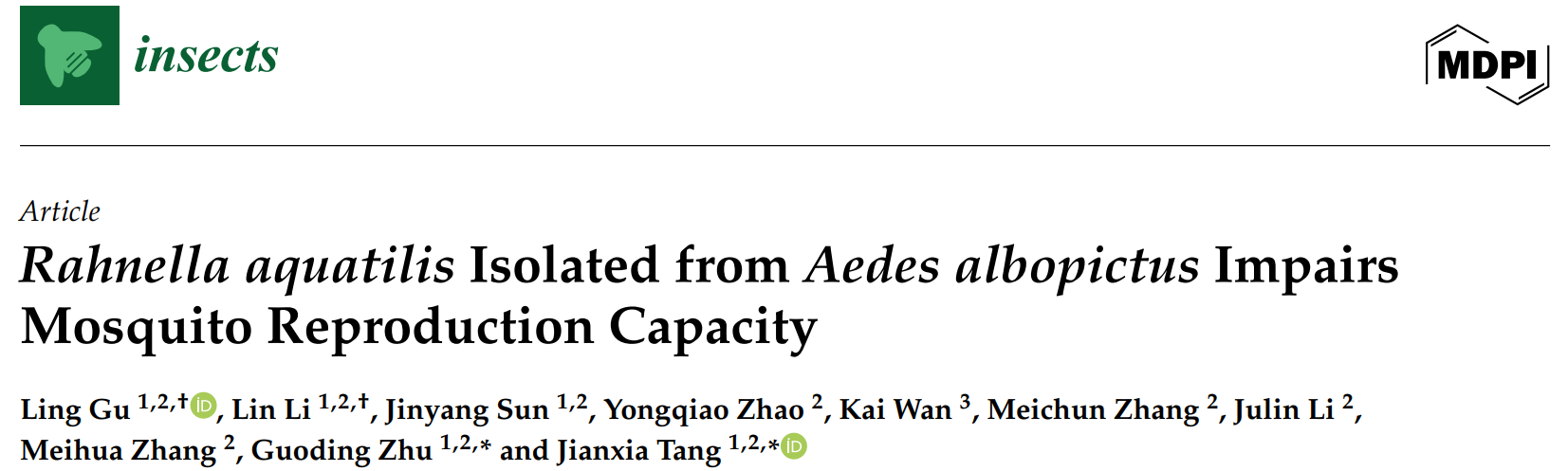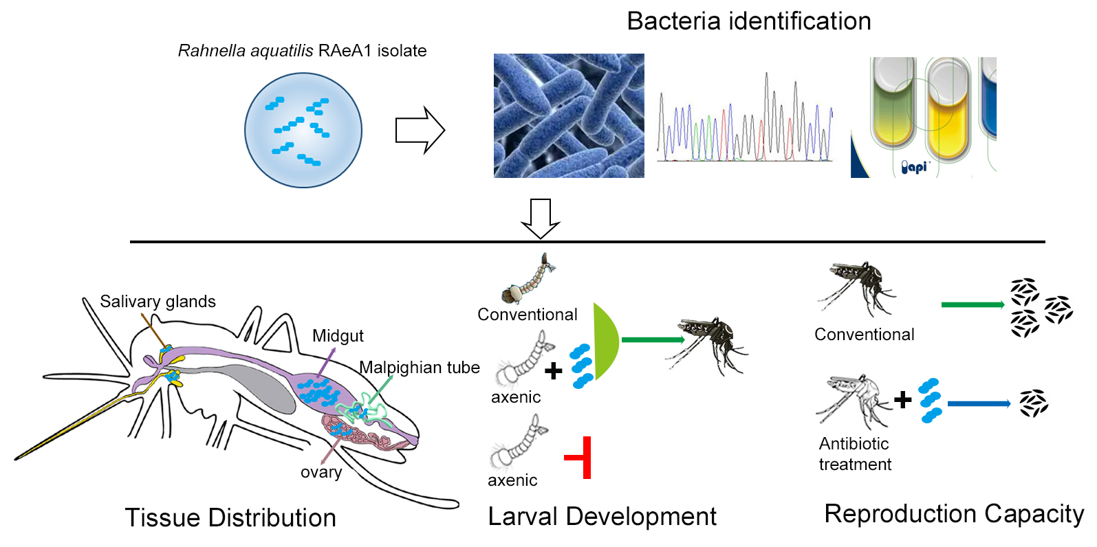 我所疟疾团队在《Insects》期刊上发表了题为《Rahnella aquatilis Isolated from Aedes albopictus Impairs Mosquito Reproduction Capacity》的研究文章。研究发现,从白纹伊蚊体内分离的RAeA1菌株在白纹伊蚊野外种群也中普遍存在,并且可通过亲代直接传递给子代。RAeA1能促使无菌幼虫发育为成蚊,但其化蛹时间显著延长。通过饲喂RAeA1菌株会损害雌蚊的产卵能力,影响卵巢成熟,同时降低蜕皮激素和卵黄原蛋白的合成水平。本研究系统阐述该菌的功能特性,为未来基于微生物的病媒防控策略开发提供了理论依据。